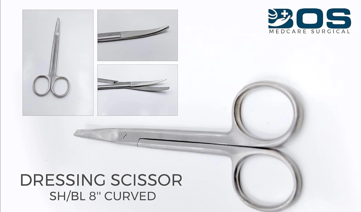 Dressing Surgical Scissor Blunt/Sharp Curved is a medical instrument used for cutting surgical dressings, bandages, gauze, and tissues during medical procedures. The curved blade design provides better visibility and precision, while the blunt/sharp tip combination allows safe cutting near delicate areas without causing injury.