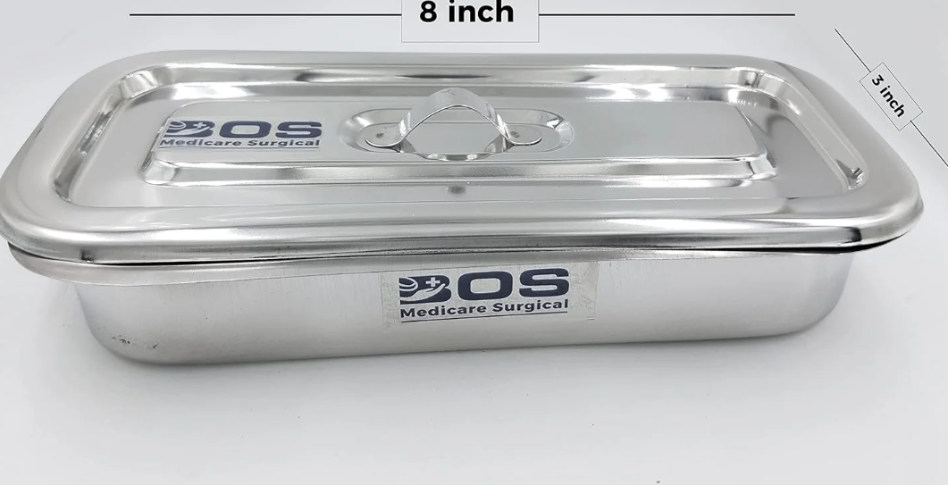 A Dressing Tray with Lid is a medical tray used for storing and carrying surgical instruments, dressings, gauze, and medical supplies in a hygienic manner. The lid helps protect the contents from dust and contamination, making it ideal for use in hospitals, clinics, and operation theatres.