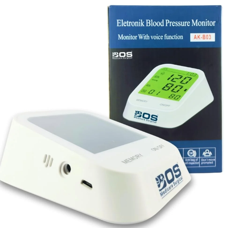 The Electronic Blood Pressure Monitor AK-B03 is an automatic digital device that measures systolic pressure, diastolic pressure, and pulse rate. The built-in voice function announces the results, making it especially helpful for elderly users or people with limited vision.