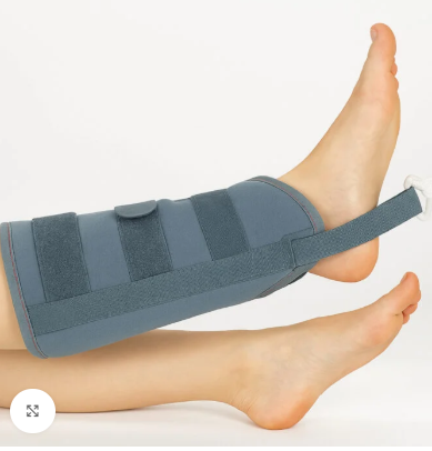 This traction belt is attached around the foot or lower leg and connected to a traction rope and weight system to gently stretch the limb. The traction helps maintain correct bone alignment and prevents movement during recovery.