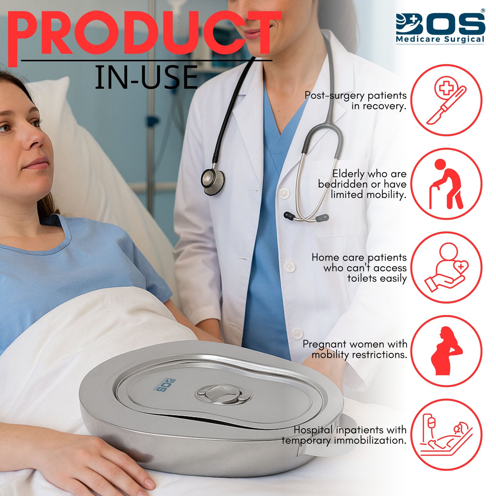 The Female Bedpan Stainless Steel by Bos Medicare Surgical is designed for patient comfort, hygiene, and durability. Crafted from premium stainless steel, it is rust-resistant, reusable, and easy to sterilize. Ideal for use in hospitals, nursing homes, and home care settings, it ensures convenience for patients with limited mobility.