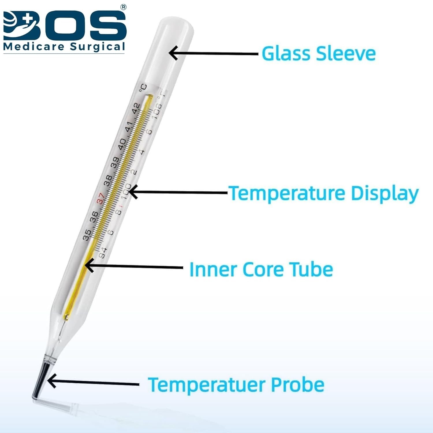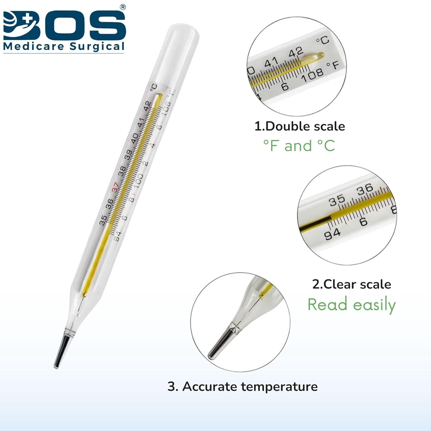 The Bos Medicare Surgical Mercury Thermometer is a precision medical instrument designed for accurate body temperature measurement in professional and home healthcare environments. Manufactured using high-quality glass and calibrated mercury technology, it delivers consistent and reliable readings without the need for batteries or electronics. This clinical thermometer is suitable for oral and axillary use, making it ideal for hospitals, clinics, nursing homes, and personal care. The clear scale markings ensure easy readability, while the compact design allows convenient handling and storage. Designed for repeated use with proper care, it remains a trusted choice for traditional temperature monitoring.